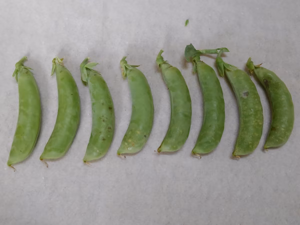 こんにちは!岩手県陸前高田市で主にミニトマトを生産しております「気仙横田うえのだい農園」です。 さやえんどう、スナップエンドウといえば春の味覚というイメージですが、北東北に位置するこのあたりでは春のお彼岸過ぎ頃から種を蒔きはじめ、旬の時期は春も終わりかけで初夏の6月からです。 栽培も終盤になり、熟した莢が増えてきたので「実取りエンドウ」(グリーンピース)としてご利用いただけるスナップエンドウを短期間・数量限定で出品いたします。 ※鮮度保持の関係上、冷蔵便でのお届けになります。 ▼品種・味の特徴・食べ方 スナップエンドウの「ニムラサラダスナップ」「豊姫」の」いずれか、もしくは両方です。 剥いて1~2%程度の塩を入れた熱湯で1分程度茹でて、グリーンピースとしてご利用ください。 ▼数量、分量の目安 莢つき重量の25~30%程度の「実」が取れます。 3枚目の画像でおよそ400gです。 ▼その他 莢は固くなっていたり黒斑があったりしますが、中の「実」は特に問題ございません。 豆の熟度は揃っておりません。どちらかと言うと一般的なグリーンピースより若めのものが多いです。 ※シワが寄って固くなっていない莢で、表面がきれいなものは食べられなくはないですが、スナップエンドウよりも筋っぽいものが多いです。