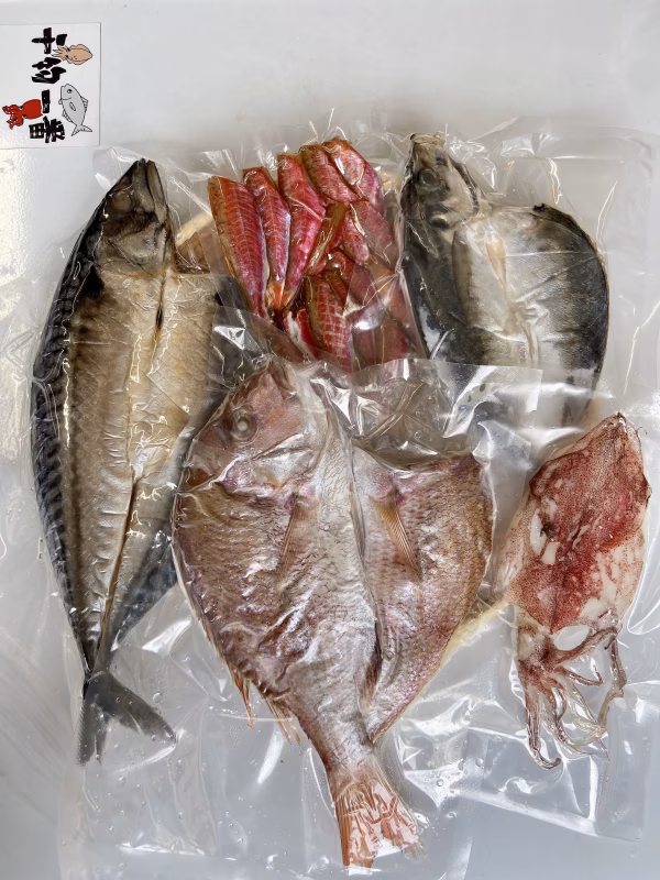 かます、真鯛、鯵、タコ、くち、ウボゼ、いとより、イモエソ、めっき、マイカ、ヒイカ、ひめじ、太刀魚みりん干し、太刀魚塩干しなどなど他