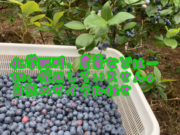 山林だった丘を30年がかりで切り開き、肥沃な土で化学肥料肥料、農薬を一切、使わず自然の力で育てたブルーベリーです。