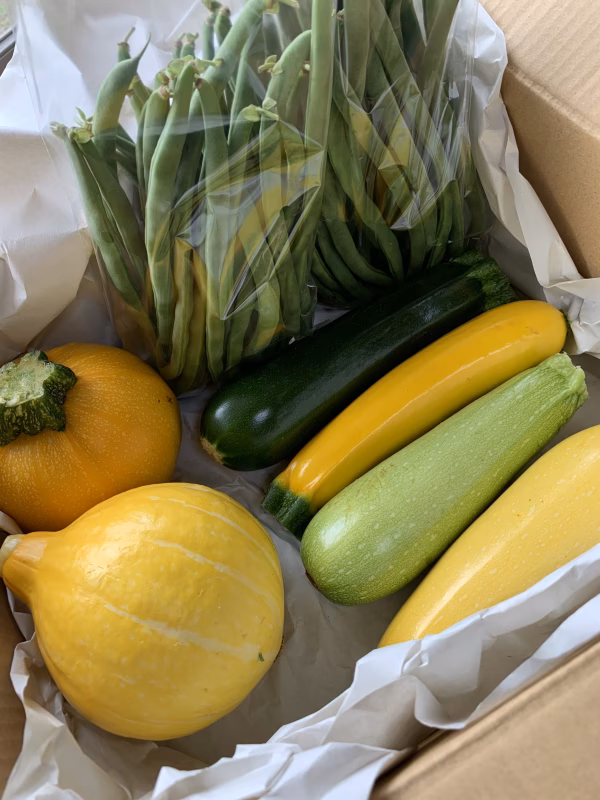 ズッキーニ、ミズナ、ルッコラを、箱詰めしてお届けいたします。