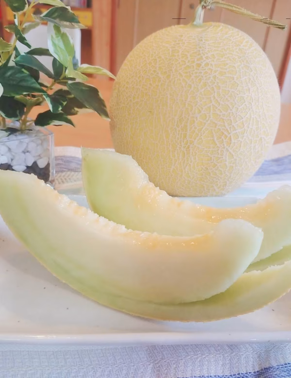 派手な見た目に反して、淡い緑の果肉、ハネデューの肉質とメロンとしては素朴な味わいであり、新しい驚きを感じていただけるかと思います。