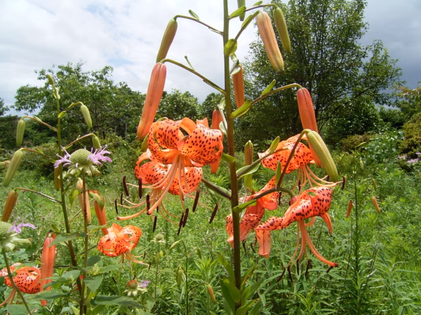 ユリの原種の一つで背丈は100~200cm程度でオレンジ色の花には斑点があり、花弁はそっくり返った形をしています。