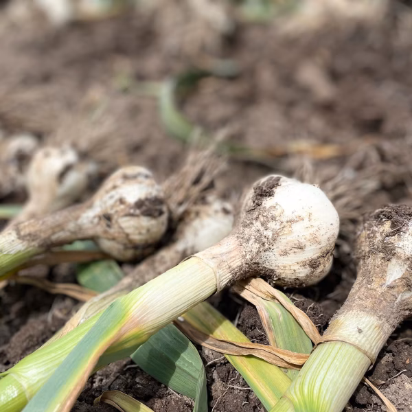 あえて粘土質の畑を選び、厳しい環境で育てたたくましいにんにくです。