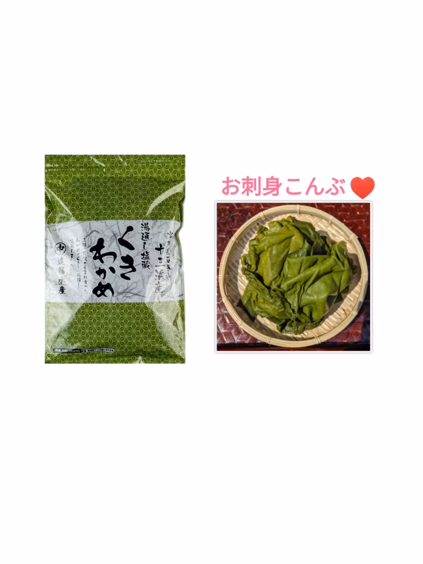 - ●茎わかめ 名称:湯通し塩蔵わかめ 原材料:わかめ(十三浜産)、塩 内容量:400g ●お刺身昆布 名称:湯通し塩蔵昆布 原材料:昆布(十三浜産)、塩 内容量:400g 製造者:宮城県石巻市北上町十三浜字大指89-2 ㊥マルナカ遠藤水産 遠藤俊彦