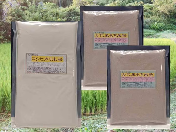 「コシヒカリ米粉」1袋と「古代米もち米粉」2袋のパックになります。