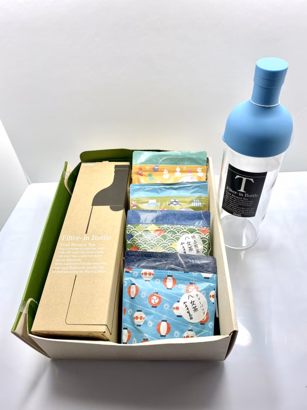 八女特上煎茶とティーバック、茶葉をそのまま入れて冷茶が作れるフィルターインボトルの詰め合わせ。