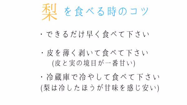 - ・到着後は出来るだけ早く食べて下さい ・保存期間としては冷蔵庫で保管し、長くても1週間程度です 「美味しい食べ方」 ①出来るだけ早く食べて下さい(日がたつごとに味が落ちていく) ②皮と実の境目が一番美味しいので、皮はできるだけ薄く剥いて下さい ③冷蔵庫で冷やして食べて下さい(梨の場合、冷えたほうが甘みを感じやすい) 梨は収穫後も呼吸をしています。その為、木から離れてしまった梨は自分がもっている栄養や水分を使い呼吸を始めます。自分のパワーを使いきる前に食べてやって下さい。保存方法としては高温の場所は避けたいので必ず冷蔵庫にて保存して下さい。より理想的なのは水分の蒸発も避けたいので、新聞紙やジップロックなどに入れた状態で冷蔵庫保存がお勧めです。期限として長くて1周間程度です。日にちが経てばたつほど味の方は落ちて行きます。