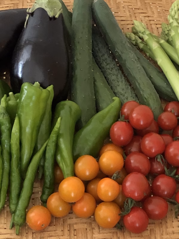 その他の野菜は米ナス、ピーマン、伏見甘長、キュウリ 、アスパラなど旬の夏野菜が入ります。