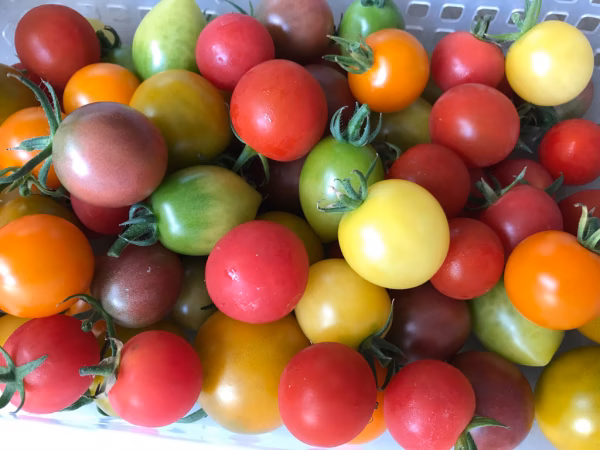 富山県南砺市の野菜農家ログログファームが農薬や化学肥料を使わずに育てた、ミニトマトです。赤、桃、薄黄、黄、オレンジ、オリーブイエロー、紫、緑、ゼブラなどをミックスした、見ているだけで楽しくなるような大人気カラフルミニトマト♪色あいだけではなく、風味の違いを食べ比べてみてね!甘いものからさっぱりしたもの、食感や香りも全然違う、それぞれのミニトマトの個性を感じられますよ!