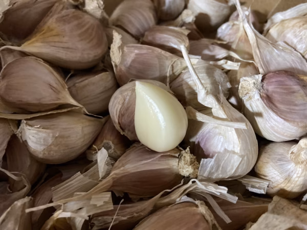 青森のホワイト六片と見た目が似ていますが、球のサイズが大きめで皮に赤みを帯びています。ニンニクらしい味と香りがありますが、比較的マイルドで翌日に匂いが残りにくいと感じています。