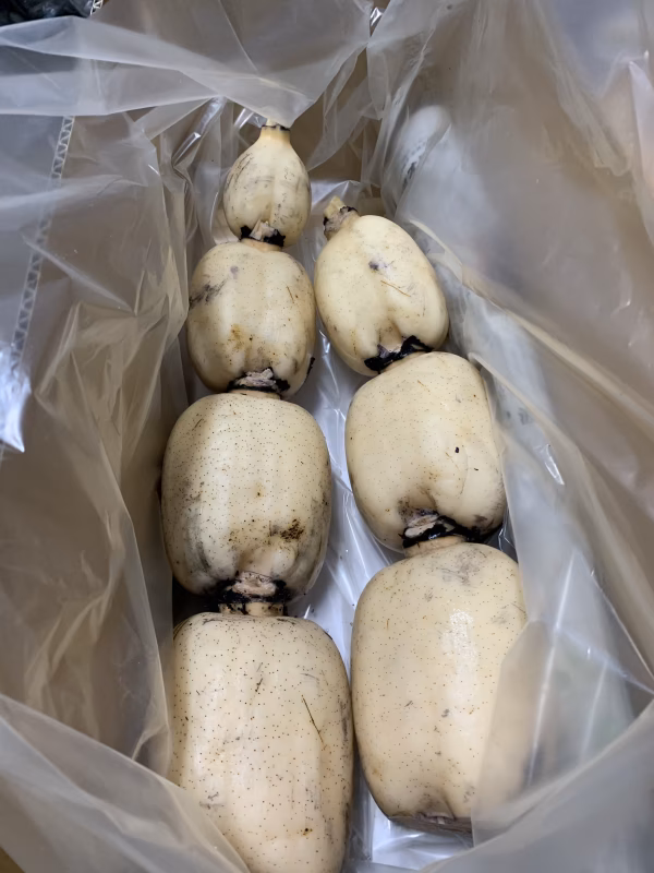 8月から11月は気温が高くクール便にて対応させていただきます。表皮の赤茶色の付着は土中に含まれている鉄分で無害ですのでご安心ください。