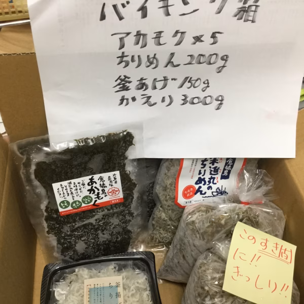 釜揚げたっぷりセットがいい、アカモクをそのすきまに!など要望いただけばそれで作ります。なので一日6個が限界最終日31日は特にお気を付けください