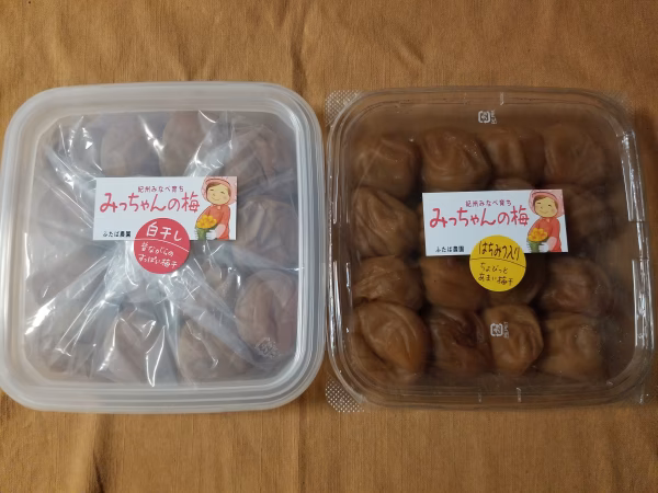 梅干専門農家みっちゃん家の畑で採れた梅を 塩だけで漬けた昔ながらの梅干し(塩分20%)と 塩分20%の梅干しを少し塩抜きして はちみつ入りの調味料に漬けて ほんの少し甘く味付けした はちみつ梅(塩分8%)のセットです。