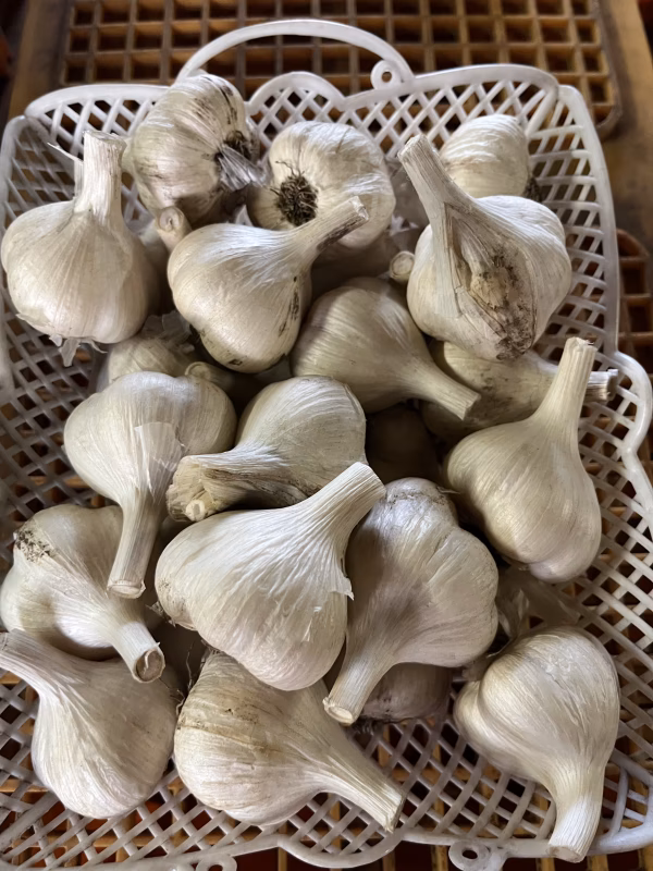 今年6月に収穫した青森県産にんにくです。小さめの球ですが、2枚目の画像のように皮を脱ぐと一粒一粒が大きめです。