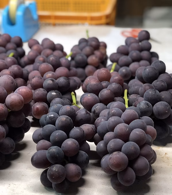 ぶどうは夜間の温度が下がることで色が黒くなりますが、今年は暑い日が続く天候異常でうまく黒くならず困っております。しかし酸度は抜けて糖度は増しております。写真の様な巨峰をお届けになります。一部酸味の残る粒がある場合がございます。