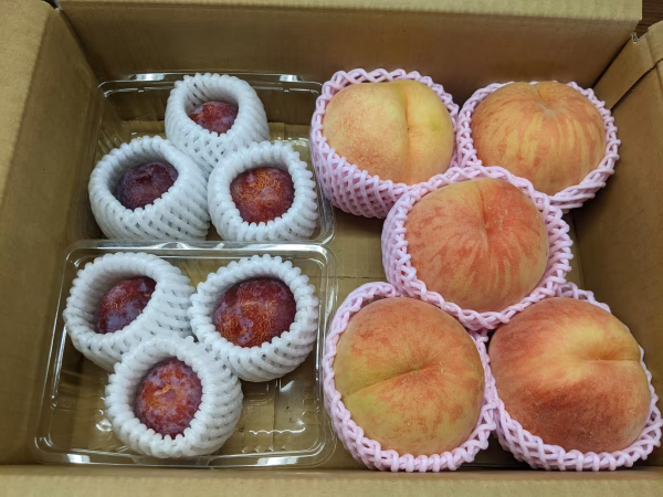 すももの品種は貴陽で、1個当たり約80gです。桃はあかつきで1個あたり350〜400gです。