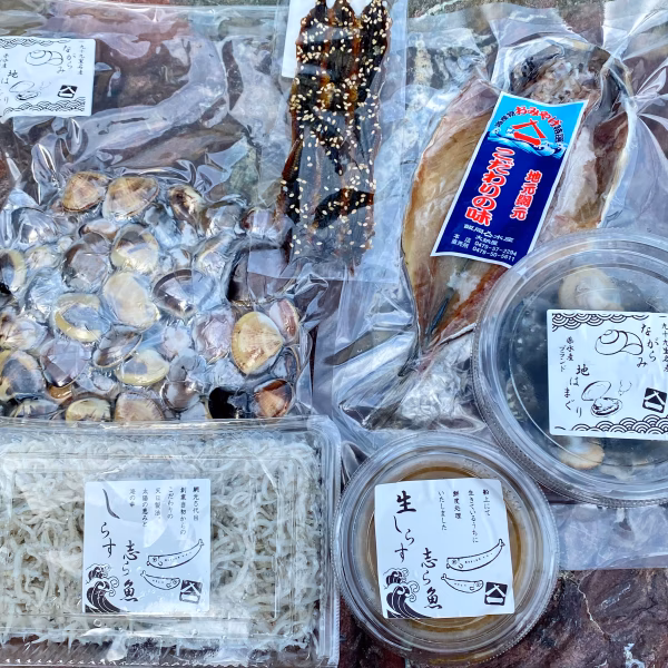 ポケマル様6周年を記念して ヤマイチ6種盛り福袋セットを期間限定でおつくりしました♪ 【九十九里産冷凍ハマグリ】 1P(約500g) 千葉県ブランド水産物認定品である九十九里地はまぐりになります。 サイズは大から小までサイズはランダムになりますのでご了承ください。(写真5枚目参照) 【九十九里産釜茹でながらみ】  1P(約200g) 千葉県九十九里浜で揚がった鮮度抜群のながらみを 大釜にて低温で時間をかけて塩茹でして丁寧に仕上げました♪ 当店殿堂入りの、大人気商品です♪ 【生しらすの沖漬け】 1P(約100g) 期間限定品!シラス独特のほろ苦い味わいと沖漬けの醤油ベースのタレの甘しょっぱさがマッチして沖漬け丼にしても酒の肴にもどちらにもあう味付けとなっております♪ 【千葉銚子産アジの開き】 1P(1尾) 銚子港で水揚げされたアジは、当店でも地の方々から長年愛されている一品です♪ 【釜揚げシラス】 1P(約120g) 九十九里産のシラスを先代から受け継がれる 手釜製法、天日干し製法 にてふっくらしっとり仕上げた自慢の一品です♪ 【イワシの味醂】 1P(1枚) 味醂漬けし、天日干ししたカタクチイワシの開き!酒の肴に最高の逸品です◎ ※在庫状況により、写真のセットとは内容が変更する場合もございます。欠品の品と同等額の品と変更としますが、追記に記載しますのでご購入前に必ず追記文もご確認ください。