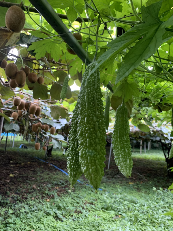 農薬なし、化成肥料なし、安心安全なキウイ畑のゴーヤたち。