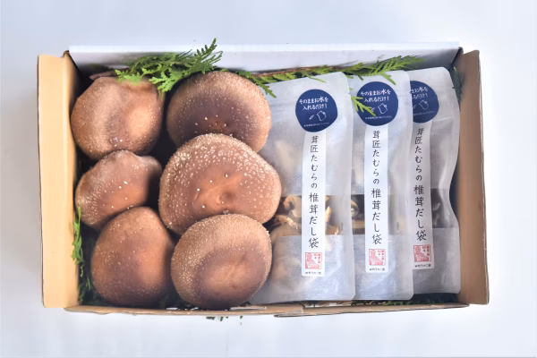 福王しいたけのなかでも大きい直径8~10cm程度のものと袋に直接お水を入れるだけで簡単にほっと安らげる椎茸だしを楽しめる「茸匠たむらの椎茸だし袋」のセットです。贈り物にもご自宅用にもどうぞ!
