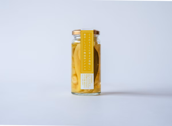 大切に育てた黄辛こしょうは、オリジナルブレンドのピクルス液に手作りで漬けられています。もちろん添加物不使用ですよ。