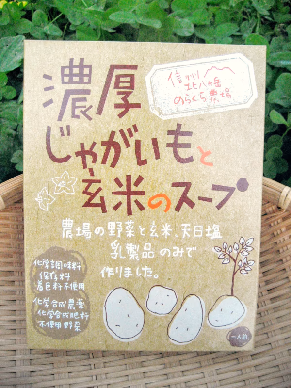 - ・かぼちゃ かぼちゃ、玉ねぎ、牛乳、生クリーム、玄米、食塩 ・じゃがいも じゃがいも、玉ねぎ、牛乳、生クリーム、玄米、食塩