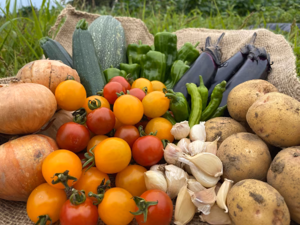 北海道石狩郡当別町にある自然栽培農場で育った夏野菜です。  今年は昨年と異なり雨が多い夏ではありますが、本州の夏に比べ、 30度前後の気温で心地よい気候となっています。これは人間だけでなく 野菜たちにとっても適温気候での栽培となり、北海道ならではの野菜の旨味に繋がっていると感じています。 トマト「ステラミニ・フルーティー美味・エイトマン等」約1kg ナス 「真黒ナスもしくは黒秀ナス」 約500g ピーマン「京みどり」 約300g ズッキーニ「ブラックビューティ・バンビーノ]約1kg 唐辛子「なんばん唐辛子」約50g じゃがいも「キタアカリ」約500g 玉ねぎ「ノンクーラー(愛媛産)約500g ニンニク 約100g 収穫のタイミング、気候状況などによって内容物・内容量が多少変わる事が ございます。ご了承ください。