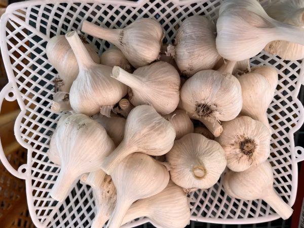 今年6月に収穫した青森県産にんにくです。小さい球ですが、一粒一粒が大きめですので、丸揚げや醤油漬けにお使いいただけます。また、毎日のお料理での使い切りにも便利です。