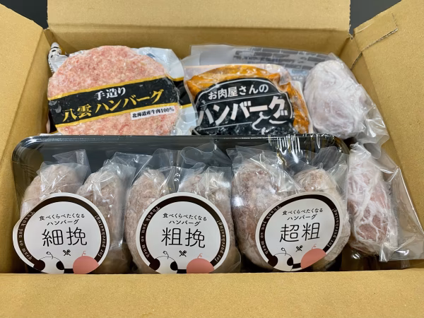 細挽・粗挽・超粗挽と3種類あり、味付けは同じですが挽き方でお肉の味わいが変わるのを食べくらべてをお楽しみください。細挽はしっとりジューシーと、粗挽は肉々しいさとジューシーさを併せ持ったハンバーグ、超粗挽きは肉感強めのガツンと食感のハンバーグとなっております。