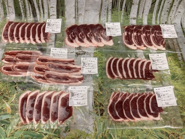 スライス肉は5mm 厚の猪肉を100g単位でパック、8パックで4〜5人前の量になります。