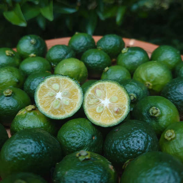 独特の爽やかな香りと酸味が特徴の柑橘で、焼き魚や揚げ物、焼酎などにレモンの代わりとして絞ると、一味違った味と香りを楽しめます。また、シロップ漬けやジュースにしても美味しくいただけます。