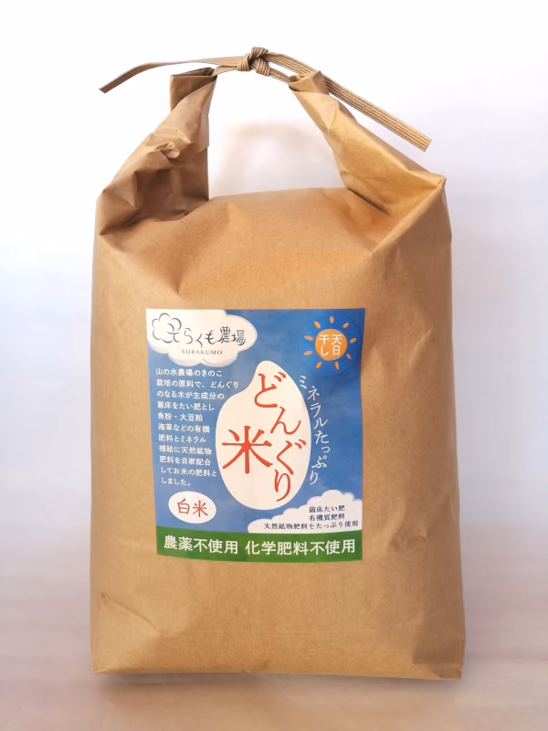 山の水農場のきのこ栽培で使われるどんぐりがなる木が主成分の廃菌床を堆肥とし、魚粉、大豆粕、海藻、米糠などの良質有機肥料とミネラル補給のため、天然鉱物肥料を自家配合してお米の肥料としました。
