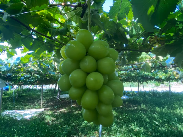 朝陽を浴び始めた朝獲りのシャインマスカットを