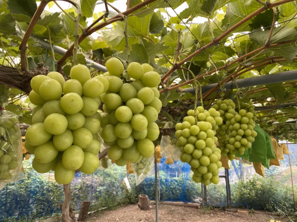 ▼雨除けのビニールハウスで栽培をしています。ジベレリンなどで種なしの処理を行っていますが、たまに種が残っている場合もございます。