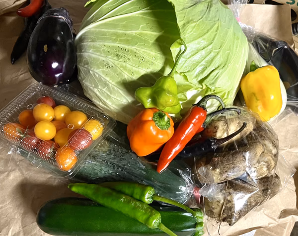 四葉きゅうり・水茄子・キャベツ、じゃがいも(とうや)、激辛なんばん、中なす、ズッキーニ、里芋、パプリカ、カラフルミニトマト。。他、いろいろな中から3種類~4種類入ります。