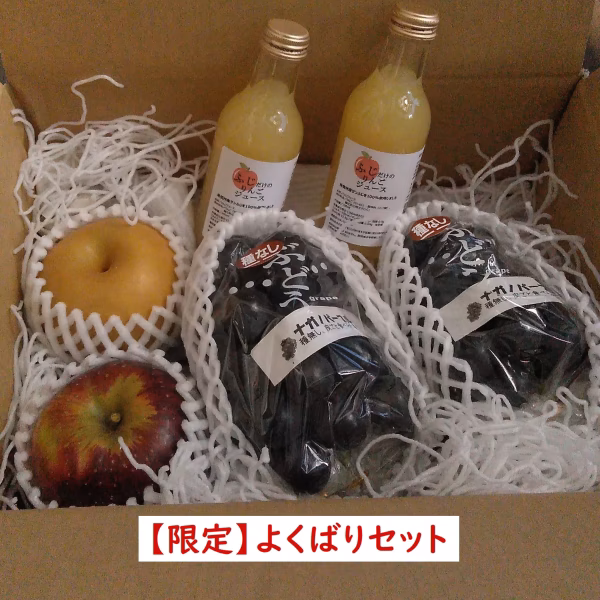 ぶどうナガノパープルが大小の房組み合わせ・リンゴ・梨・ジュース、さらにおまけ付き(内容はおまかせ)です