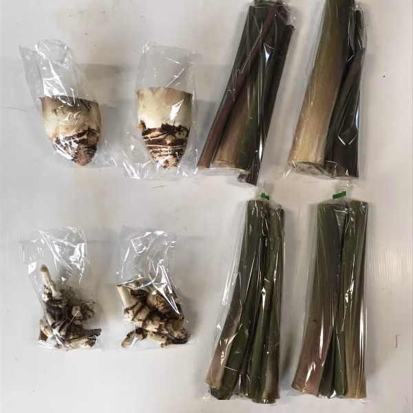 ズイキ(芋茎、葉柄)は皮を剥いて水にとり灰汁止めします。拍子型に切ってもう一度水にとります。それから塩茹でして水にとります。しっかりと絞って酢の物にします。味噌汁の具や煮物にも向きます。