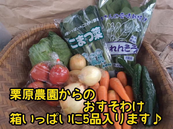 栗原農園では 年間通じて様々な農産物を栽培しお届けしています。 80サイズの段ボール箱に5品目の農産物をお届けします。 隙間があればオマケ付き♪ ふるさとの両親からお届けされるような 温かみあふれる農産物の詰め合わせとなります。 ■新高梨1個入ります。 400~500グラムの家庭用の新高梨1個入ります ◆発送はヤマトクール冷蔵便で発送します◆ ※発送は火曜日と金曜日を予定しています。  日曜~水曜、ご注文は金曜日を予定しています。  木曜~土曜、ご注文は火曜日を予定しています。  天候などによって遅れる場合は連絡します。 ※画像はサンプル用です  発送時期によって品目が変わる場合があります。 ※苦手な農産物や手元にある農産物など  ありましたら事前にお知らせください。 ※内容物に関しましては旬の実物、葉物、根物、果物が発送されます。 ※なるべく早くお届け出来るように頑張りますが  お天気次第で収穫が出来ないときがあります。