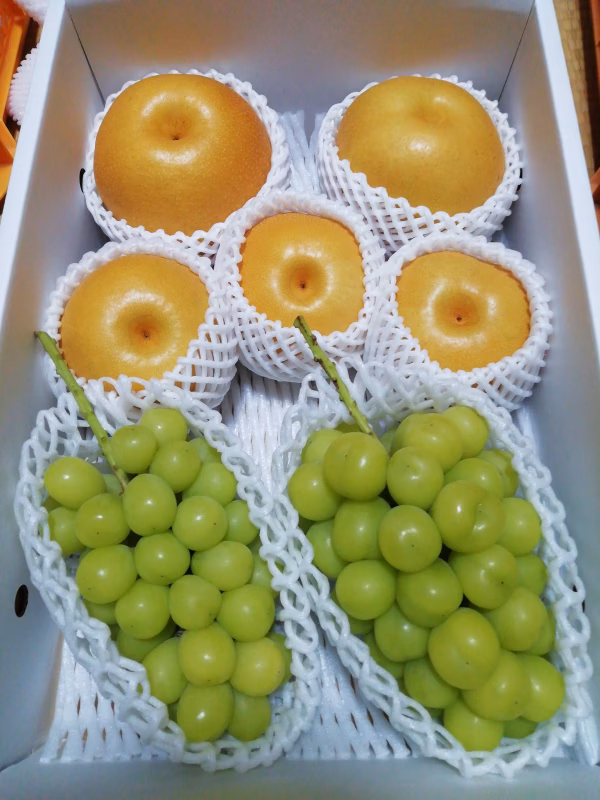 《アルコアーナ農園完熟シャインマスカットと和梨セット》★クール便★ 種なし、皮ごと食べられる一番人気のシャインマスカットと アルコアーナ農園人気の和梨(幸水、または豊水、またはあきづき)のセットが新登場‼️ 今だけの限定販売です。 ★毎日、その日ピークを迎えたシャインマスカットと和梨を収穫し、もぎたてを直送いたしますので、新鮮なとりたての味をお楽しみいただけます。 ●シャインマスカット ・種なし、皮ごと食べられるシャインマスカットは甘くてジューシーでお子様にも大人気の美味しい葡萄です。マスカットの高貴な香りが満点です。 ・しっかりと樹上完熟したシャインマスカットのみ収穫します。 ※アルコアーナ農園のシャインマスカットは黄緑色です。 完熟すると黄色に近い色になってきます。ゴールドシャインマスカットと呼ばれテレビでも話題です。また、茶色のシミが出る場合がありますが、高糖度の証ですのでご了承ください。 ※若木のため粒はまだ小さめですが、味は甘くて美味しいです。 ●和梨 ・平棚栽培ですので果実一つ一つにまんべんなく太陽の光があたります。 ・無袋栽培ですので、太陽の恵みをたっぷり浴びた梨です。 ※無袋栽培のため多少のキズ、葉すれ、へこみ、変形、肌がキレイでない等の和梨も入ります。 ・摘果をし果実の数を制限することで、一つ一つに栄養がしっかり行き渡ります。 ・もちろん除草剤は一切使わず、草生栽培です。 ・果樹栽培が盛んなここ山形県上山市は、昼夜の寒暖差が大きく、昼はたっぷり光合成をし、夜は気温がぐっと冷え込むことで、栄養が果実にしっかりと蓄えられます。 ▼注文に際しての注意点(配送方法や納期指定など) ・和梨の品種はおまかせとなります。 ・細心の注意をはらい梱包をしておりますが、葡萄は配送中に実が房から落ちたり、割れてしまう場合がございますこと、予めご了承ください。 ・完熟となり次第発送いたしますので、お日にち指定は承れませんが、受け取れない日がわかっている場合はご注文の際にお申し付けください。時間指定はできます。 ・発送時の管理は万全を期してますが、万が一、破損などの不備があった場合は到着後2日以内にご連絡ください。 ・ご不在等により商品を受け取れなかった場合の再発送は致しかねます。