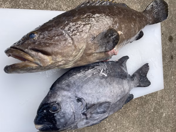 今朝の素潜り漁で海に潜り銛で突いたクエと石鯛です。