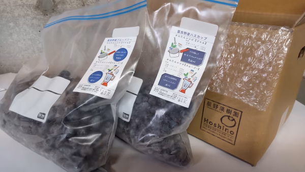 当果樹園のハスカップは熟したものを手摘みし、選別をして果実のつぶれや葉などの異物の混入のないことを確認し冷凍パックしています。
