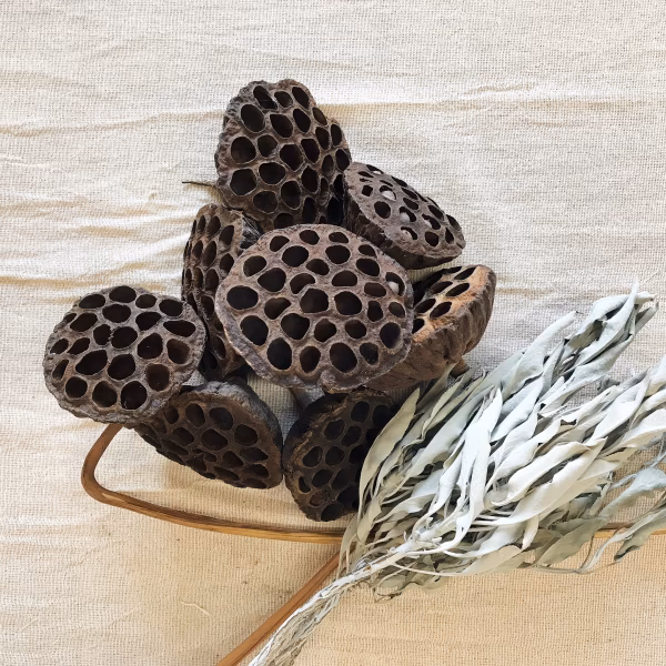 れんこんの花托です。 ドライフラワー、リースやスワッグ作りなど、ハンドメイド資材にいかがでしょうか。 もちろんそのまま飾っても。 直径10cm程度(個体によりばらつきあり) 10個前後(箱に入るだけ) 種が入っているものはそのまま。 ※ある程度きれいにしてお送りしますが、自然のものなので取りきれないものもあります。 壊れやすいものなので輸送中に多少の欠けなどあるかと思います。 ご了承いただけると幸いです。