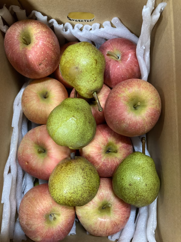 ラフランス約3キロ位、りんご約2キロ位です。合わせて5キロ超えるようにラフランスで調整します♪