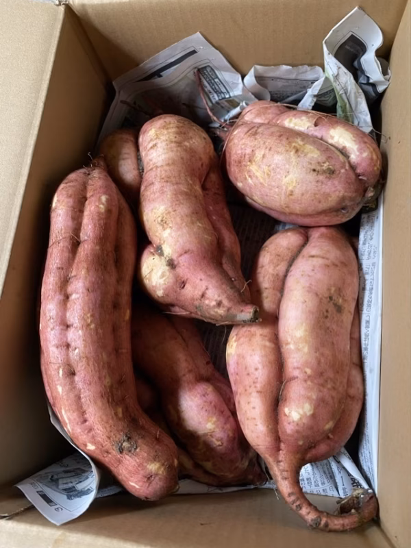 安納芋に初チャレンジしました。 順調に生育し豊作です! 色もよく旨味も乗っているため、期待を裏切らない出来になりました。 洗うと皮が剥けてしまうため掘り立てで、まだ土付きのままで段ボールに入れて送らせていただきます。 大きいもので1kg超えのものや小さいもので500gのものなどサイズはバラバラです。 注文数量に合わせますが大きさによって少し足りない場合もあるかもしれません。ご了承ください。 掘り立ては《ホクホク》、収穫後、12月、1月寒さを乗り越えると、デンプンが糖化し、《ねっとりあま〜い安納芋》へと変わっていくそうです。 農薬、化学肥料不使用、完全な自然栽培です。兵庫の真ん中の清流で育ちました。 是非ご賞味ください。