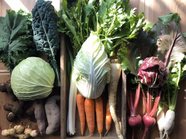 2015年より永続的に採種と栽培が可能である作物「固定種」のみを栽培しています。近年主流の一代交配種(通称F1種)に比べ、生育の勢いや姿形の揃いが劣るとされていますが、しっかりした素材の風味がかけがえのない魅力だと思っています。長く厳しい冬の前に、旨味を蓄え寒さに耐えた格別の野菜をお届けします。