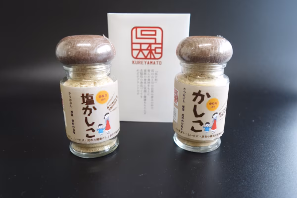 「塩かしこ」しいたけ、かつおぶし、昆布のおだしをパウダーにした「かしこ」に、伯方の塩を加えました。旨味とミネラルのハーモニー。揚げ物、天ぷらにふりかけたり、おむすびにしてお召し上がりください。