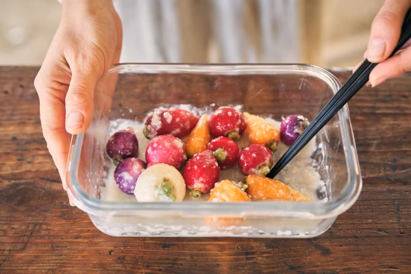 ミニ野菜なのでカットする必要がなく、洗ったらそのまま塩こうじに漬けることができます。また、