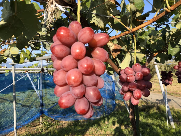 深みのある赤系ブドウの「クイーンルージュ®︎」は、爽やかな香りと強い甘みが特徴で、“赤いシャインマスカット”とも呼ばれ、種無しで皮ごと食べられます。