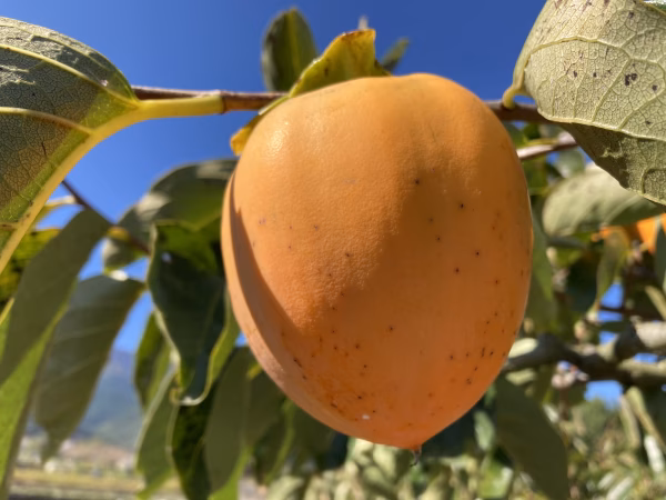 こちらは枯露柿・ころ柿・あんぽ柿など干し柿の原料となる渋柿の種類で甲州百目柿といいます。甲州百目柿は大玉も多く、肉厚でねっとりとした食感と豊かな果汁で甘味も強く仕上がることで評判の品種です。