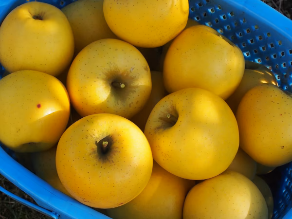 名前の通り果皮は黄色、というより黄金色で、特に晴れた日のシナノゴールドの畑は、りんごがとても美しく映えます。貯蔵性に優れ、長い期間お楽しみいただけるのも人気の理由です!