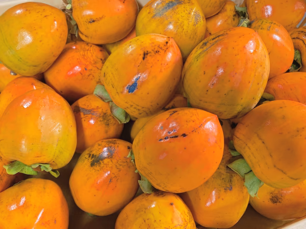こちらは枯露柿・ころ柿・あんぽ柿など干し柿の原料となる渋柿の種類で甲州百目柿といいます。甲州百目柿は大玉も多く、肉厚でねっとりとした食感と豊かな果汁で甘味も強く仕上がることで評判の品種です。